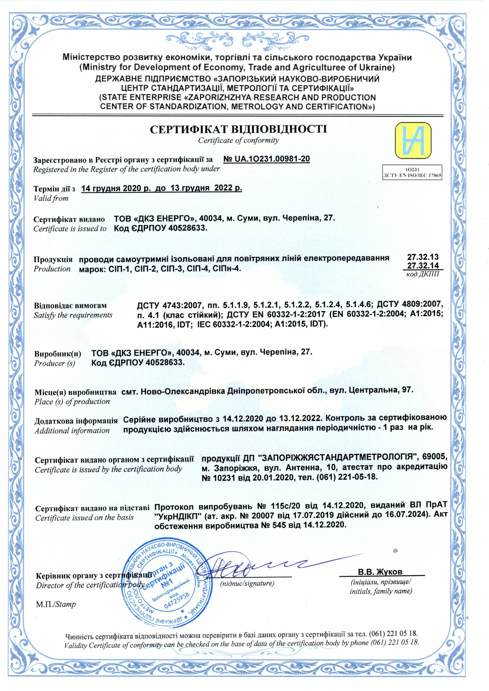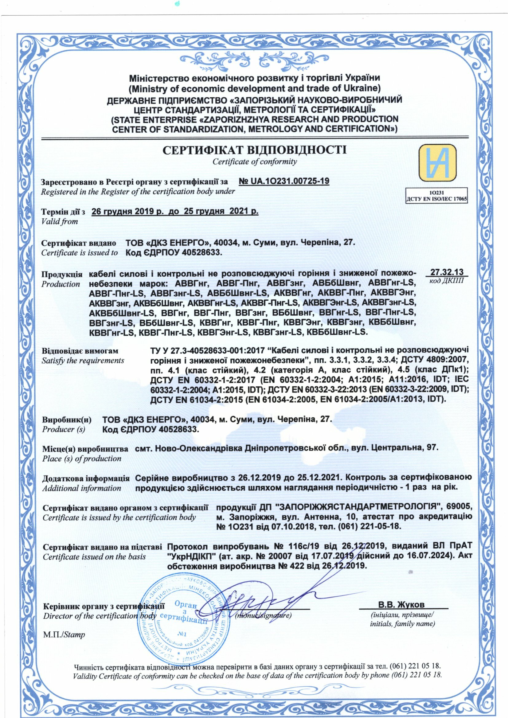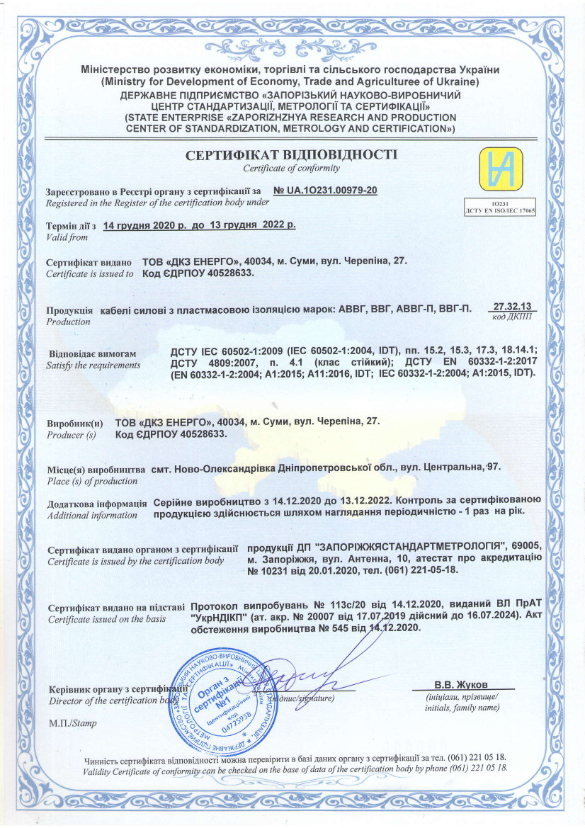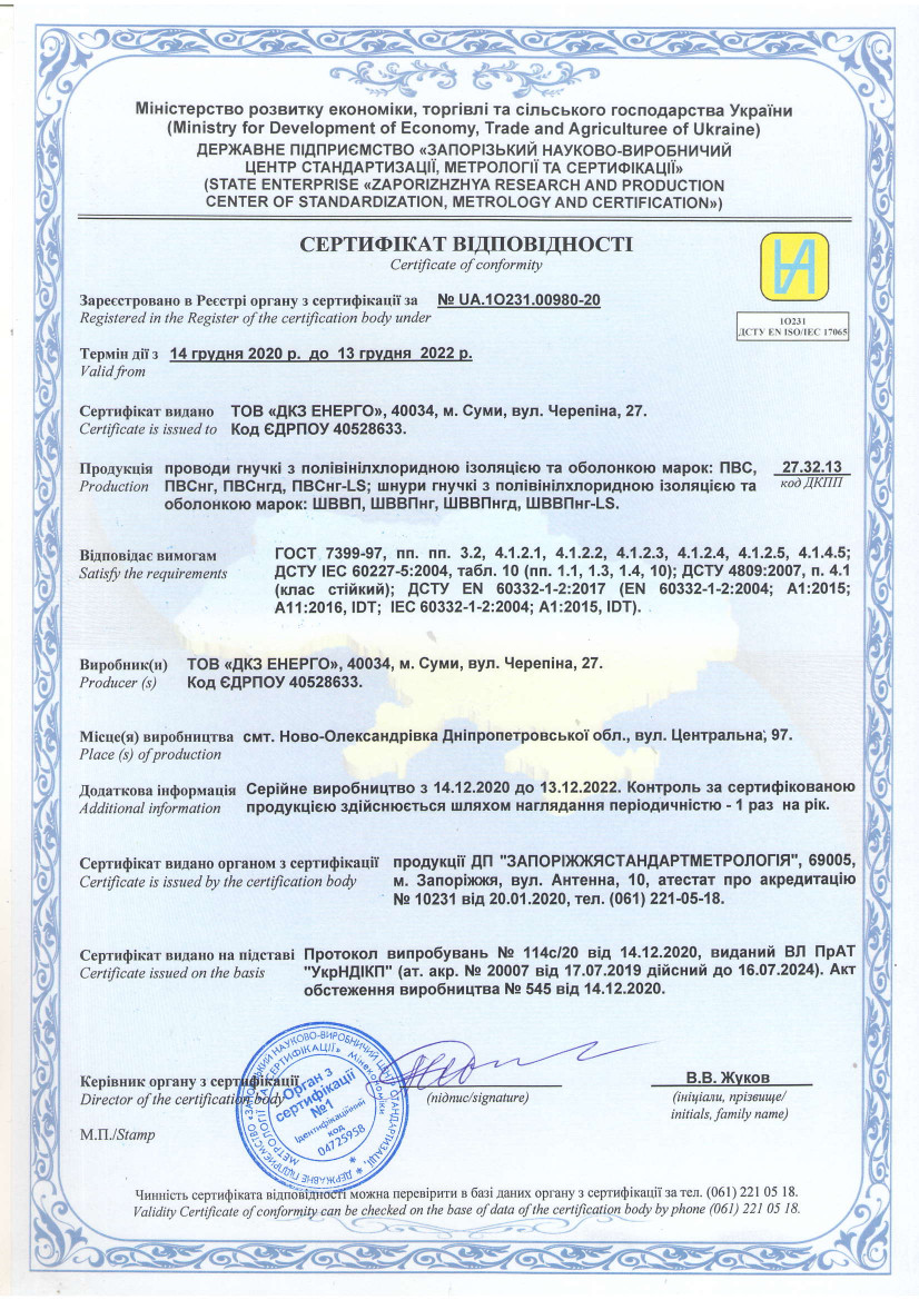 Особлива увага приділяється якості наших товарів, тому вся кабельно-провідникова продукція кабельного заводу "ДКЗ Енерго" проходить добровільну державну сертифікацію, про що є сертифікати відповідності державного зразка, з якими Ви можете ознайомитися нижче. Кожна вироблена партія кабелів проходить внутрішню перевірку на відповідність вимогам ТУ і ДСТУ. Весь виготовлений кабель і провід відповідає вимогам контролю якості.